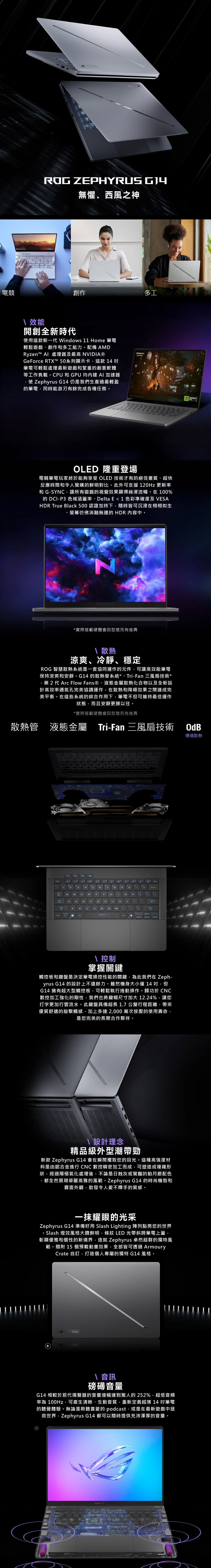 螢幕:OLED 14吋 16:10 (薄邊框) / 3K (2880 x 1800) / 120Hz / 0.2ms / 對比度100萬:1 / DCI-P3 100% / G-Sync / Pantone 認證 / Dolby Vision HDR / ROG Nebula Display