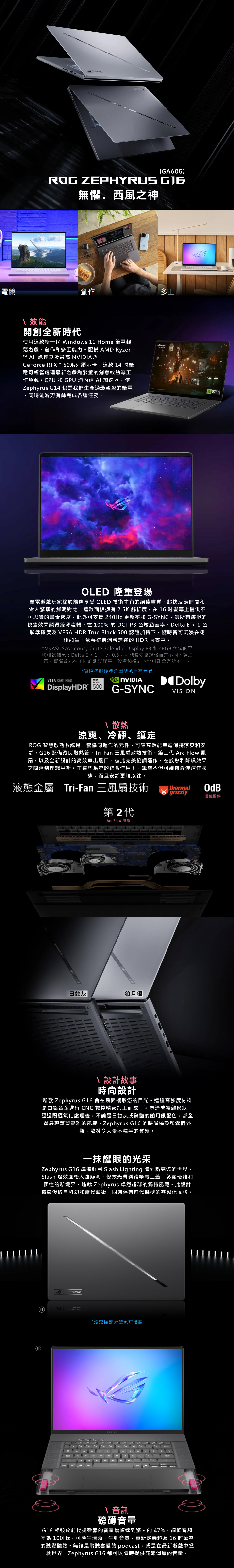 螢幕:OLED 16吋 16:10(薄邊框) / 2.5K (2560 x 1600, WQXGA) / 240Hz / 0.2ms / 對比度 100萬:1 / DCI-P3 % 100% / G-Sync / Pantone 認證 / Dolby Vision HDR / ROG Nebula Display