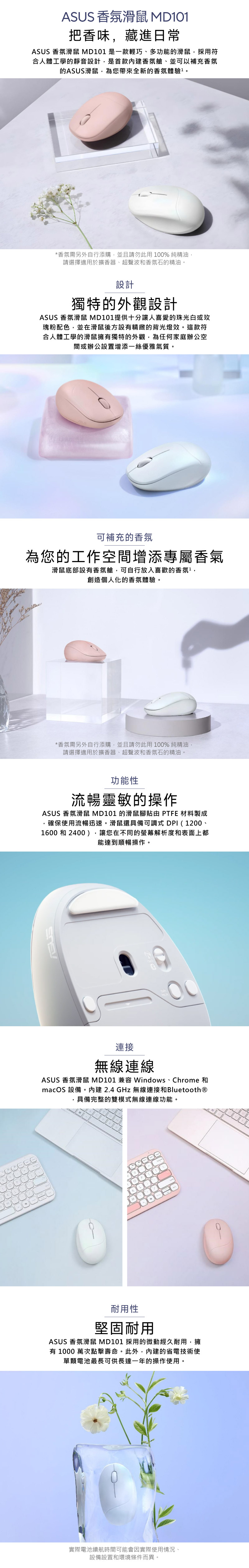 ASUS 香氛滑鼠 MD101 是一款輕巧、多功能的滑鼠,採用符合人體工學的靜音設計,是首款內建香氛艙、並可以補充香氛的ASUS滑鼠,為您帶來全新的香氛體驗。