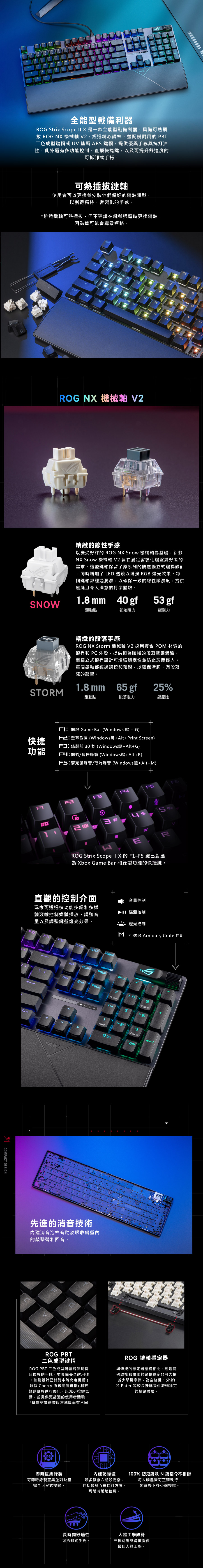 • 可熱插拔 ROG NX Snow 機械軸 V2: 支援更多鍵帽類型,並提供更輕柔的敲擊聲與更精緻的打字手感