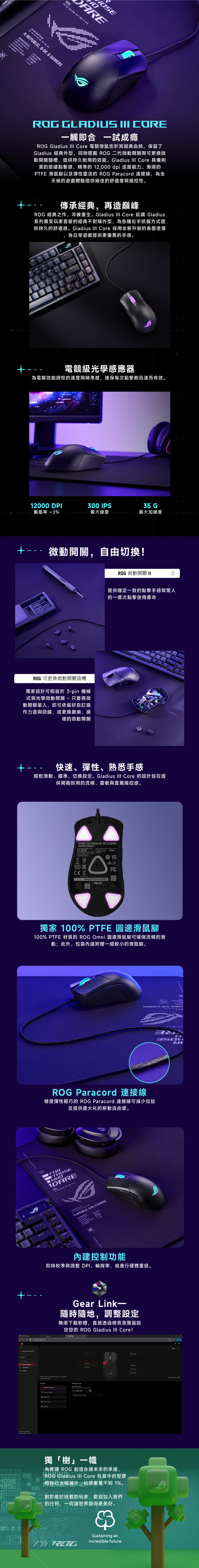 ROG Gladius III Core 是一款 71 公克的有線電競滑鼠,採用人體工學設計,搭載 12,000 dpi 光學感應器、ROG 二代微動開關、ROG 可更換微動開關插槽、ROG Paracord 連接線以及 100% PTFE 圓邊滑鼠腳