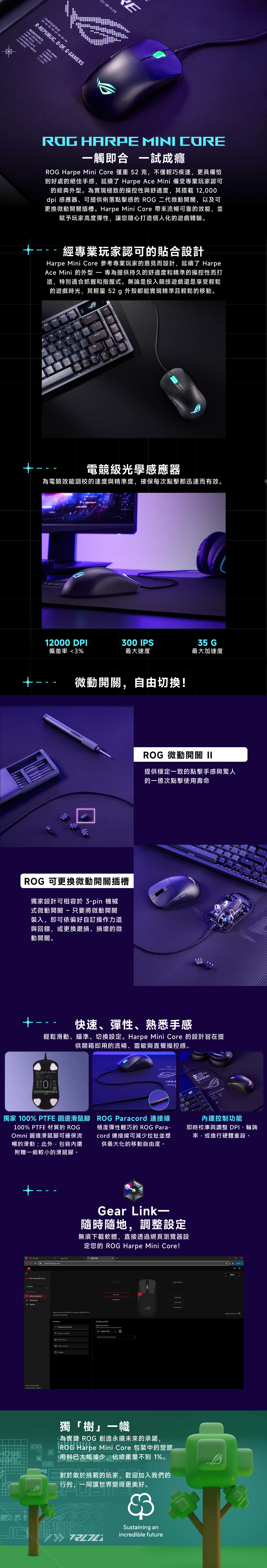 延續了HarpeAceMini備受專業玩家認可 的經典外型。為實現極致的操控性與舒適度,其搭載12,000 dpi感應器、可提供俐落點擊感的ROG三代微動開關,以及可 更換微動開開插槽。HarpeMiniCore帶來流暢可靠的效能,並