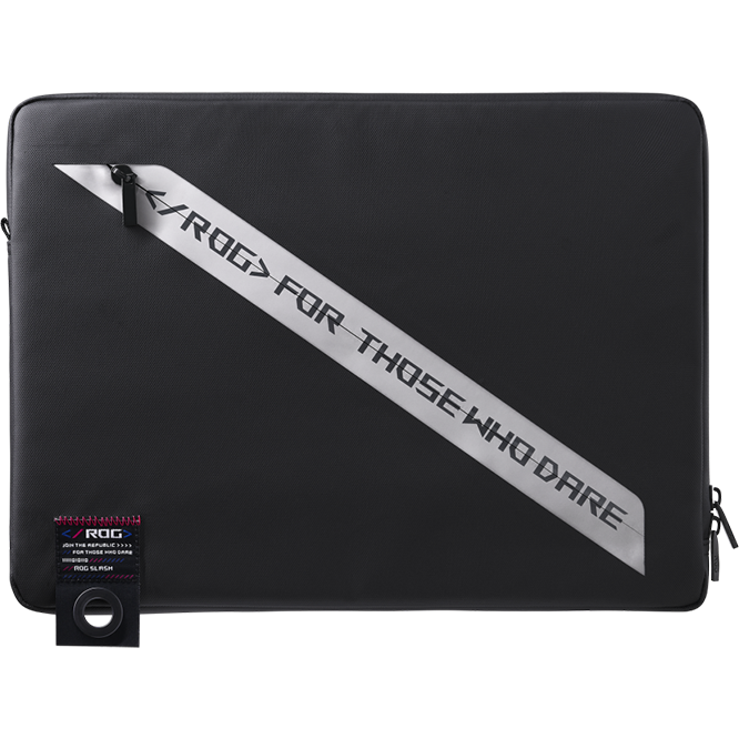 • 正面收納層採用精心設計的防水拉鍊,其中代表性的斜線設計印有 ROG 標語。