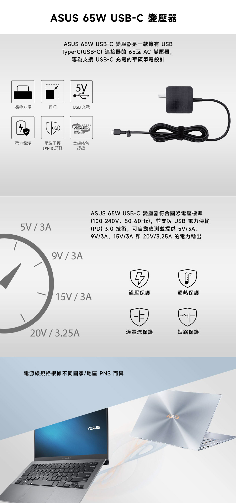 採用 USB PD3.0 技術的 USB Type-C 連接器,能夠自動偵測並提供 5V/3A、9V/3A、15V/3A 及 20V/3.25A 的輸出