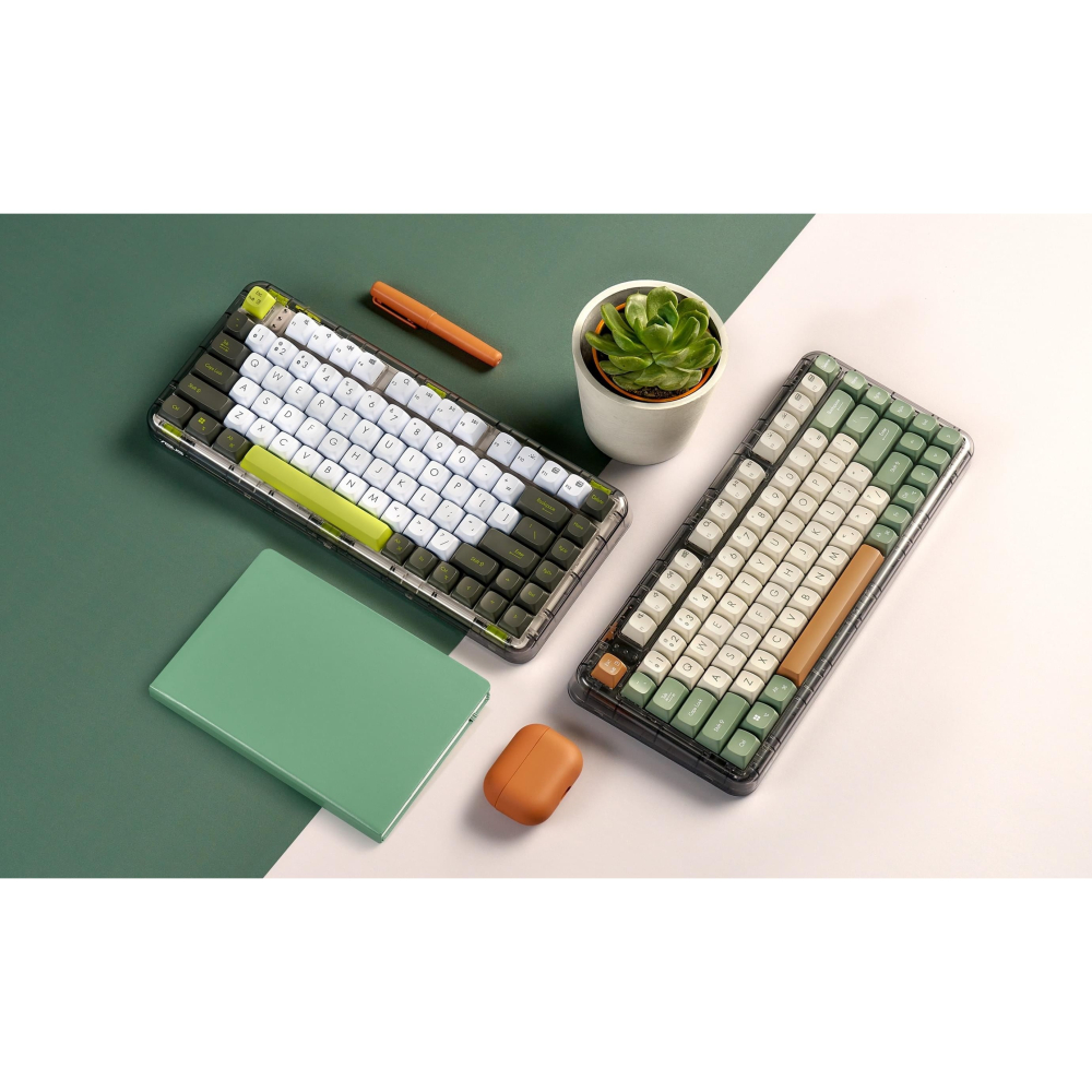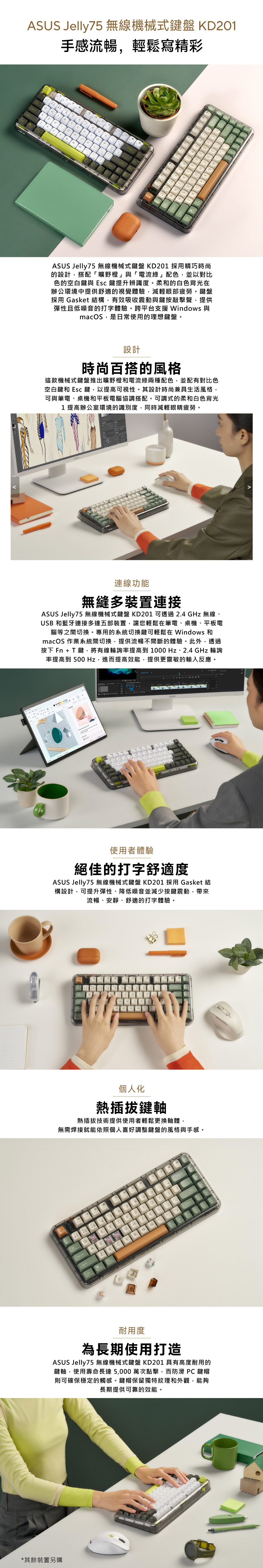 ASUS Jelly75 無線機械式鍵盤 KD201 採用精巧時尚的設計,搭配「曠野橙」與「電流綠」配色,並以對比色的空白鍵與 Esc 鍵提升辨識度。柔和的白色背光在辦公環境中提供舒適的視覺體驗,減輕眼部疲勞。鍵盤採用 Gasket 結構,有效吸收震動與鍵按敲擊聲,提供彈性且低噪音的打字體驗。跨平台支援 Windows 與 macOS,是日常使用的理想鍵盤。
