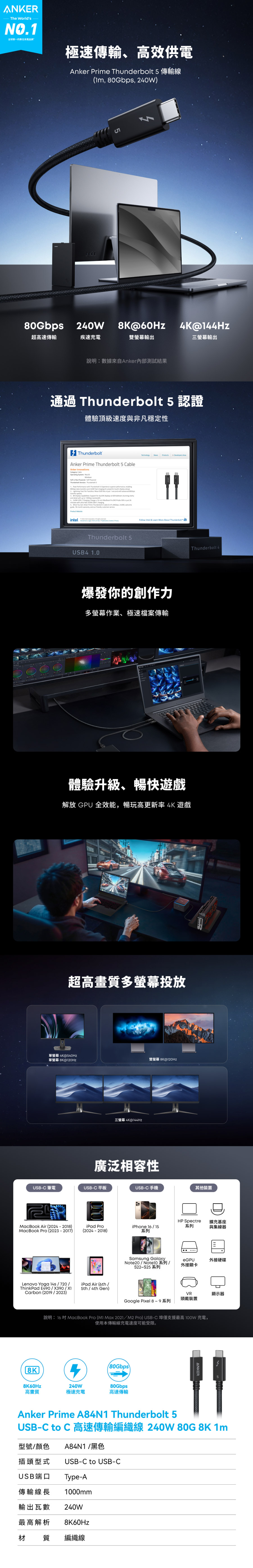 ANKER A84N1 Thunderbolt 5 USB-C to USB-C 編織充電線 1m