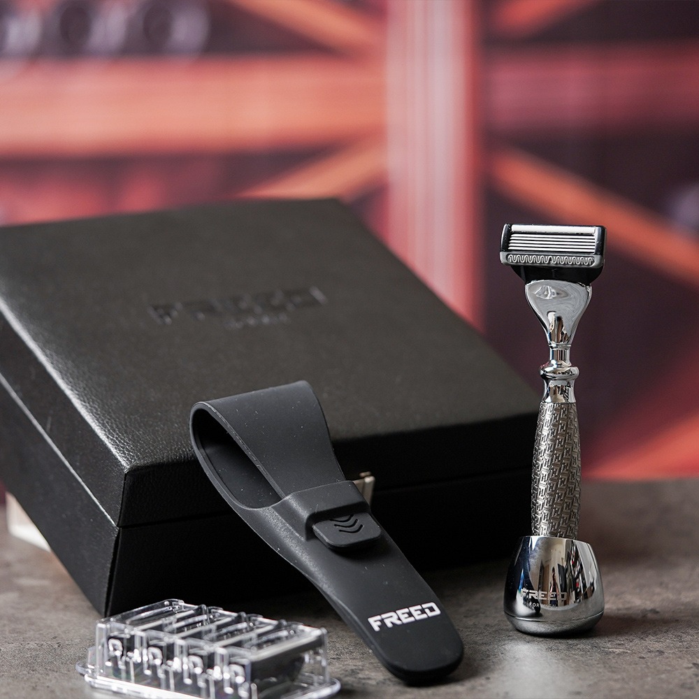 【FREED】尊爵四件組五刀式刮鬍刀禮盒 - F滿版鍍鎳浮雕