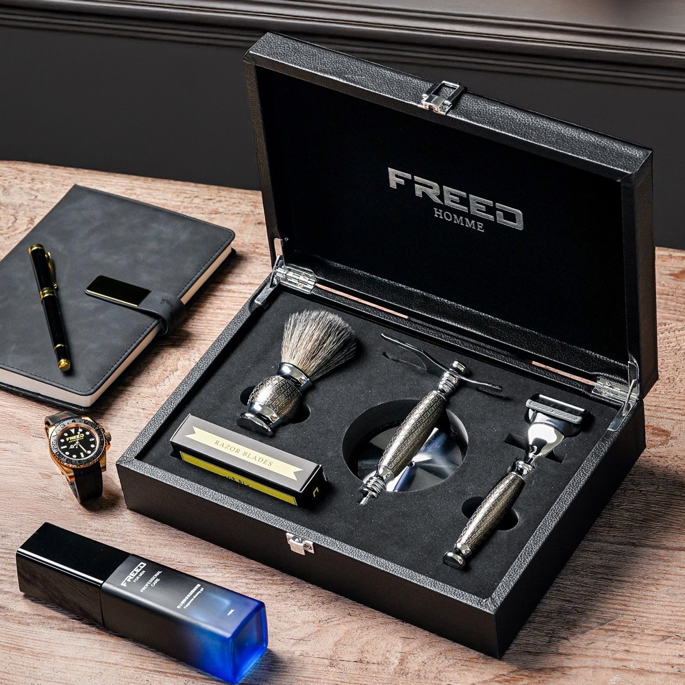 【FREED】五刀式刮鬍刀豪華禮盒四件組 - F滿版鍍鎳浮雕
