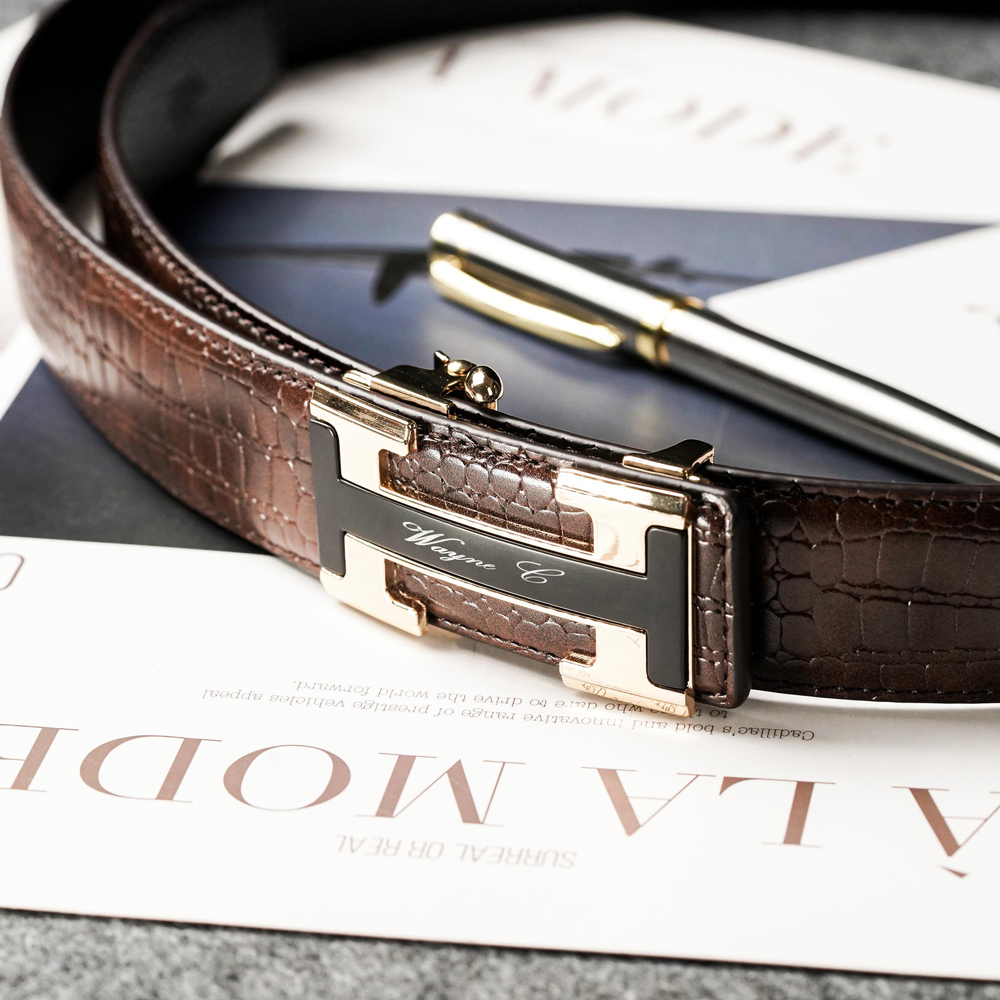 【FREED】金屬英文字母扣商務休閒頭層牛皮自動皮帶 - 黑咖
