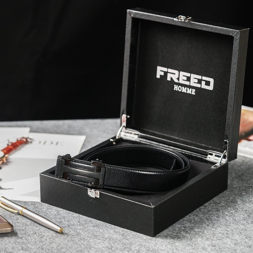 【FREED】金屬英文字母扣商務休閒頭層牛皮自動皮帶 - 黑色