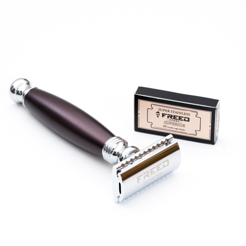 FREED首度推出復古傳統雙刃刮鬍刀,此款採用封閉式設計,搭配FREED雙刃刀片更加鋒利,完美鍍鉻工藝搭配剛好的重量配比,使用此款能夠感受到非常好的操控性,恰到好處的刀身長度,讓你能夠在每次的刮鬍都能體驗舒適的刮鬍手感。
