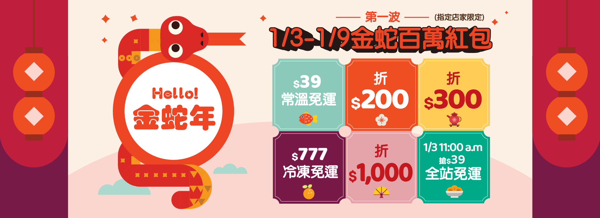 <p>歡慶金蛇年</p><p>1/3-1/9限定</p><p>滿$39常溫免運</p><p><br /></p><p>滿$777冷棟免運</p><p><span style="font-family:'-apple-system', BlinkMacSystemFont, 'Segoe UI', Roboto, 'Helvetica Neue', Arial, 'Noto Sans', sans-serif, 'Apple Color Emoji', 'Segoe UI Emoji', 'Segoe UI Symbol', 'Noto Color Emoji'&#59;font-size:1rem&#59;">滿$2,025折$200</span></p><p>滿$3,888折$300</p><p>滿16,888折$1,000</p><p><span style="font-family:'-apple-system', BlinkMacSystemFont, 'Segoe UI', Roboto, 'Helvetica Neue', Arial, 'Noto Sans', sans-serif, 'Apple Color Emoji', 'Segoe UI Emoji', 'Segoe UI Symbol', 'Noto Color Emoji'&#59;font-size:1rem&#59;">以上全站數量有限</span></p>