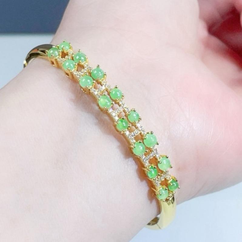 《Always9168輕奢珠寶》M01天然緬甸A貨翡翠多蛋面銀手鐲果陽綠貴妃57+S925銀鍍金送台證
