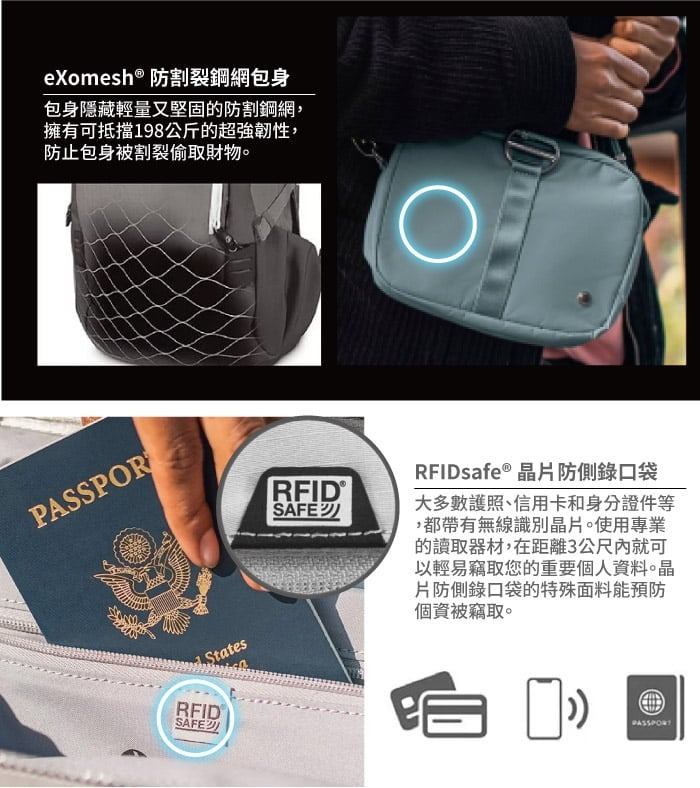 ◆eXomesh專利防割鋼網,防止包身被割裂後竊取財物