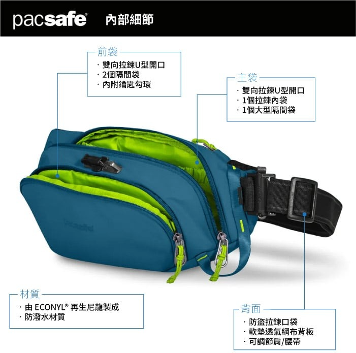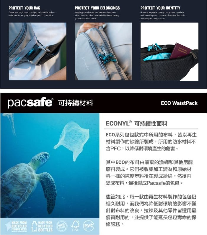 主要材質:320D ECONYL® regenerated nylon Taslon, Water resistant 1000mm, PFC free