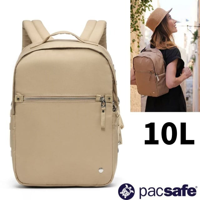 10公升的大容量,是收納日常上班或探索城市的必需品,可以放置13吋筆電、手機錢包、化妝品,側邊口袋可放雨傘水壺等,貴重物品能透過我們的專利防盜技術保護。包身布料採用再生PET製成,為地球和海洋減少一點負擔。