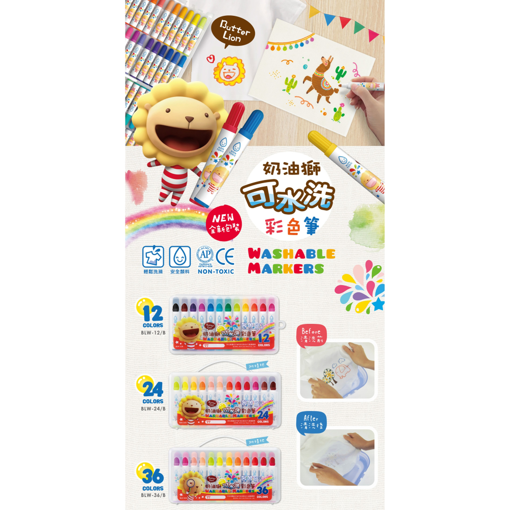 *水洗彩色筆採用可水洗無毒顏料,如果不小心畫到皮膚、衣服、床單等等,