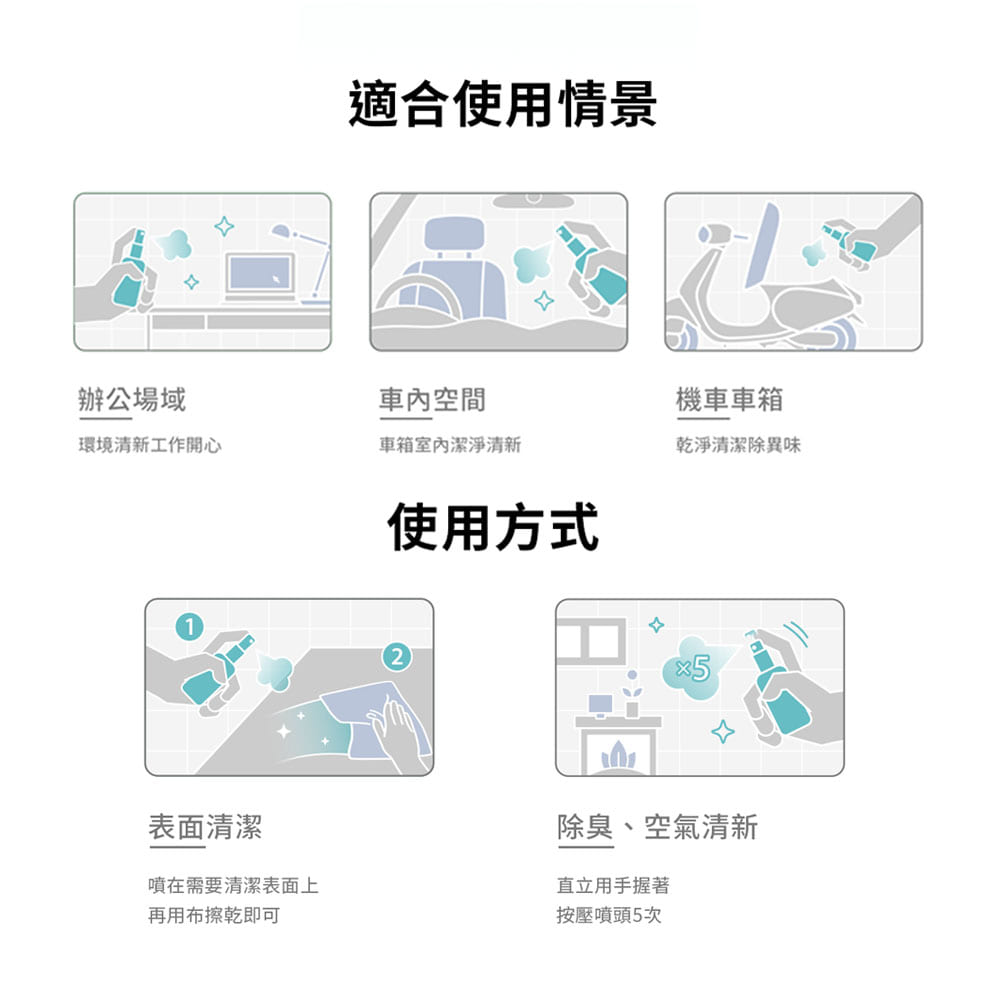 1.表面清潔: 將本產品噴在需要清潔的表面上,再用布擦乾即可。