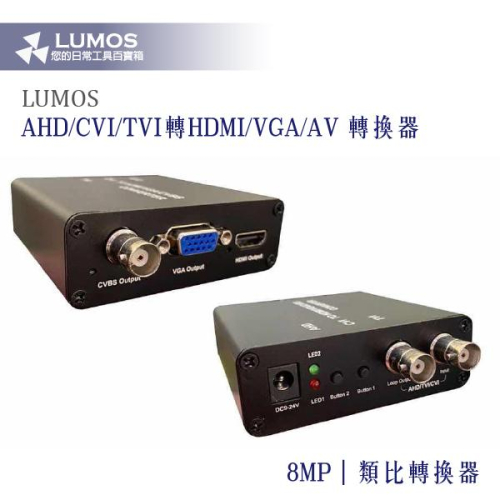 ⚠️注意⚠️輸出端HDMI/VGA/CVBS 只能擇一訊號輸出 ⚠️注意⚠️輸入端訊號可以環出 ⚠️注意⚠️純銅接頭,支援4K/8MP 產品說明: * 支援AHD/TVI/CVI同軸高清最高800萬及960H攝影機輸入 * AHD/TVI/CVI輸入端自動偵測AHD/TVI/CVI以及NSTC/PAL * AHD/TVI/CVI 轉 CVBS(AV)可以鎖定CVBS解析度50Hz/60Hz輸出,自動變頻和縮放,選擇 CVBS PAL/NTSC制式輸出 * AHD/TVI/CVI 轉 HDMI最高輸出HDMI 1920x1080解析度 * AHD/TVI/CVI to VGA最高輸出VGA 1920x1080解析度 * 2個輕觸開關: "開關1" 切換當前輸出訊號解析度 、"開關2"切換HDMI、VGA、CVBS輸出模式 產品配件: * 12V2A變壓器*1 100-240v國際電壓