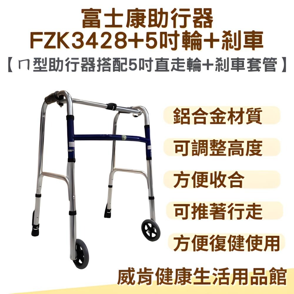 3428 ㄇ型圓管固定 助行器+5吋直走輪+剎車