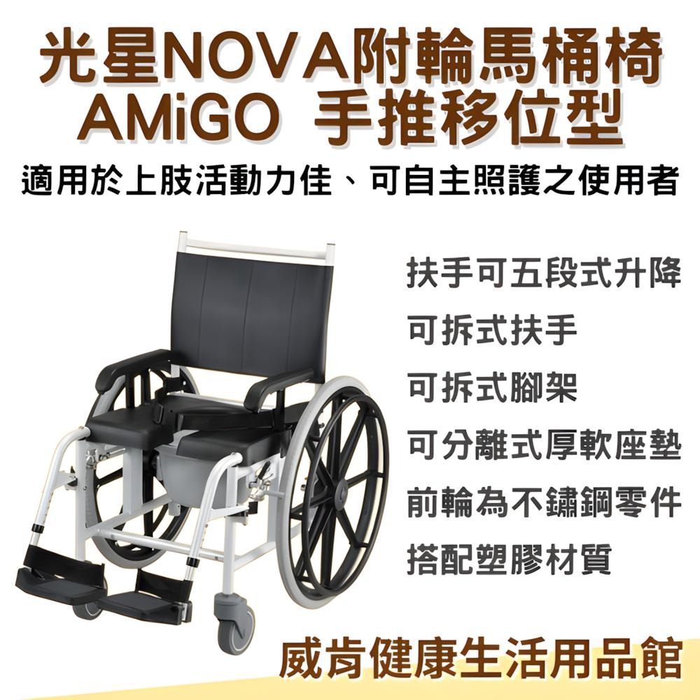AMiGO 以自我手推與安全側向移位的需求整合,其配有 24” 後輪,滿足自我推送需求,透過五段式升降、可拆式扶手、腳架的調整運用,不因位置轉移與坐立的難度縮限。適用於上肢活動力佳、可自主照護之使用者,以相輔相成的型態,作為生活中最舒適的安全導引。