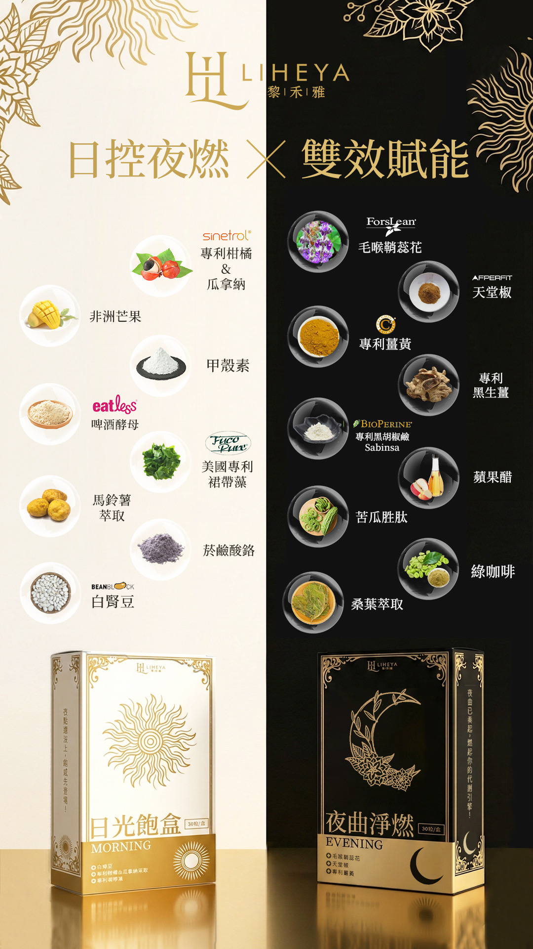 成份:專利毛喉鞘蕊花萃取、AfperFit天堂椒籽萃取、專利黑生薑發酵粉(綜合酸酵濃縮粉(黑棗、芹菜、諾麗果、黑薑)、麥芽糊精)、綠咖啡、苦瓜胜肽、C3薑黃、蘋果醋粉、桑葉萃取、Sabina’s黑胡椒鹼