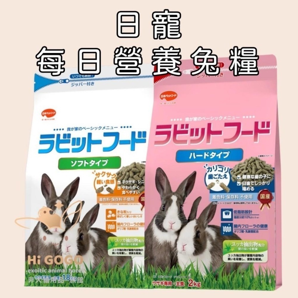 https://s-cf-tw.shopeesz.com/file/tw-11134208-7r98u-lyyyg9lj5o8k16 日寵每日營養兔糧(硬質)2kg(壓縮型) ○考量兔子健康的基本膳食。 〇有嚼勁的hard type,可用臼齒啃咬。 〇考慮到養在室內的兔子,將脂肪含量減少 10%。 〇添加乳酸菌及寡糖維持腸道健康。 〇不使用色素、防腐劑。 (因是乾糧,故無使用防腐劑。) 〇日本産。 成分: 苜蓿粉、玉米、麥麩、小麥粉、脫脂大豆、脫脂米糠、低聚醣、礦物質(鈣、磷、鈉、氯化物、鐵、銅、錳、鋅、碘、鈷)、絲蘭提取物、維生素(A) 、B1、B2、B6、B12、D、E、菸酸、泛酸、生物素)、枯草芽孢桿菌、乳酸菌、氨基酸(甲硫氨酸、賴氨酸) 日寵每日營養兔糧(軟質)1.8kg(發泡型) ○考量兔子健康的基本膳食。 〇酥脆易食用,幼兔、高齡兔都推薦食用。 〇添加黃豆粉,天然溫和。 〇添加乳酸菌及寡糖維持腸道健康。 〇不使用色素、防腐劑。 (因是乾糧,故無使用防腐劑。) 〇附夾鏈常保新鮮。 〇日本産。 成分: 麥麩、苜蓿粉、小麥粉、糖、脫脂大豆、大豆粉、啤酒酵母、低聚醣、礦物質(鈣、磷、鈉、氯化物、鐵、銅、錳、鋅、碘、鈷)、絲蘭提取物、維生素( A、B1、B2、B6、B12、D、E、菸酸、泛酸、生物素)、枯草芽孢桿菌、乳酸菌、氨基酸(甲硫氨酸、賴氨酸)
