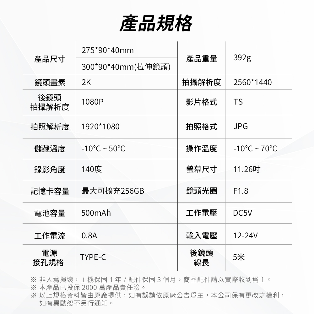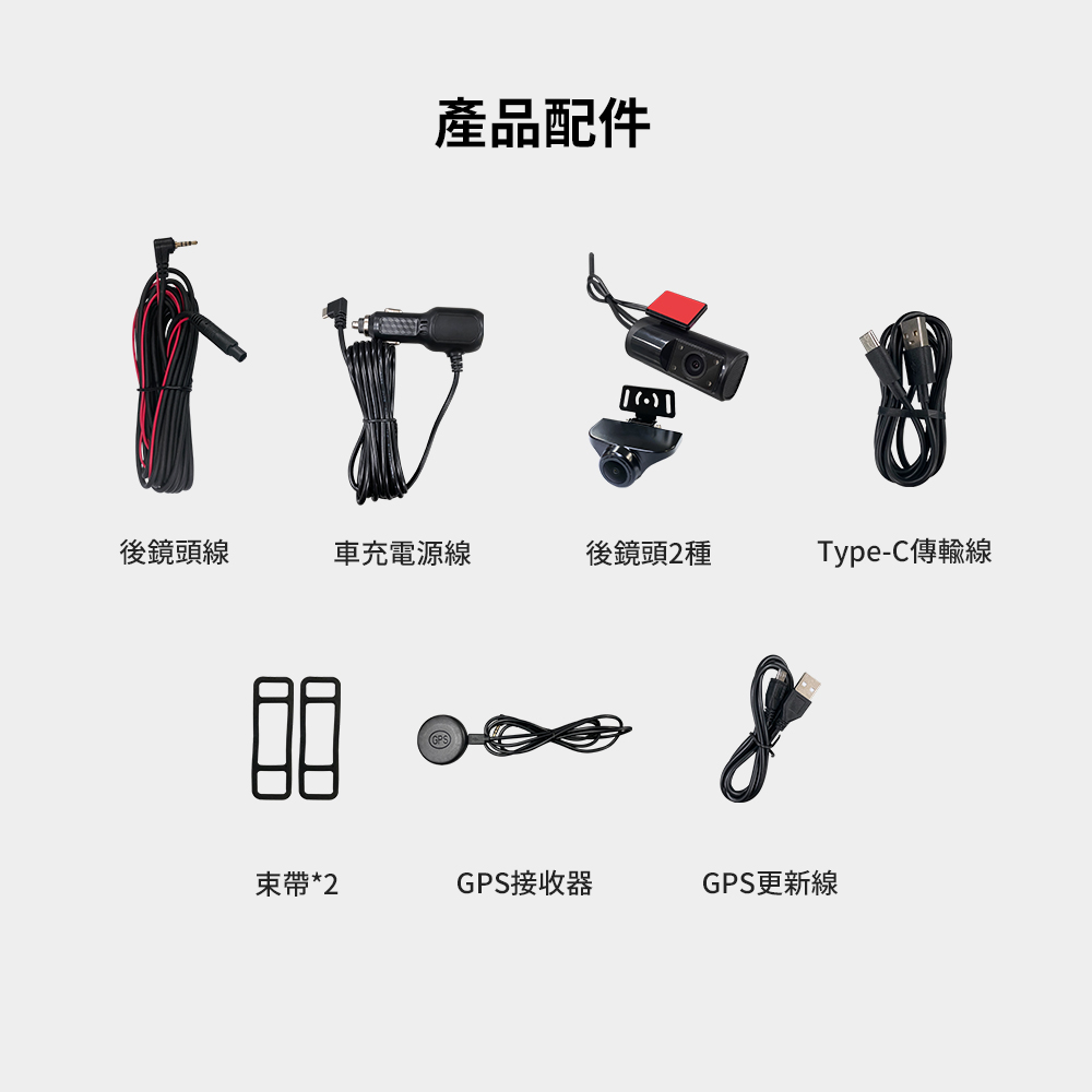 配件:主機/後鏡頭/6m後鏡頭延長線/車內鏡頭/GPS接收器/GPS更新線/3.5m車充/Type-C線/橡皮綁帶/說明書(保卡)