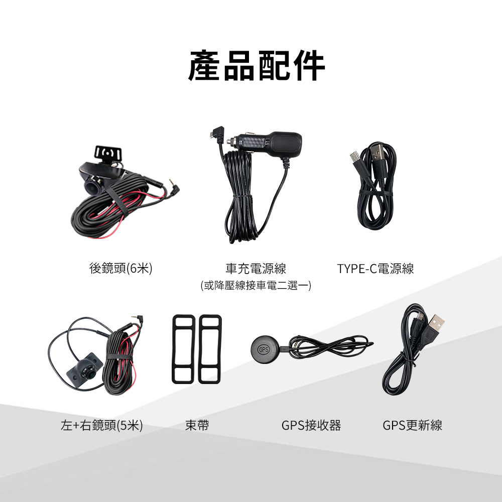 配件:主機/固定橡皮*2/後鏡頭/6m後鏡頭延長線/側邊鏡頭*2/5m側邊鏡頭線*2/GPS接收器/GPS更新線