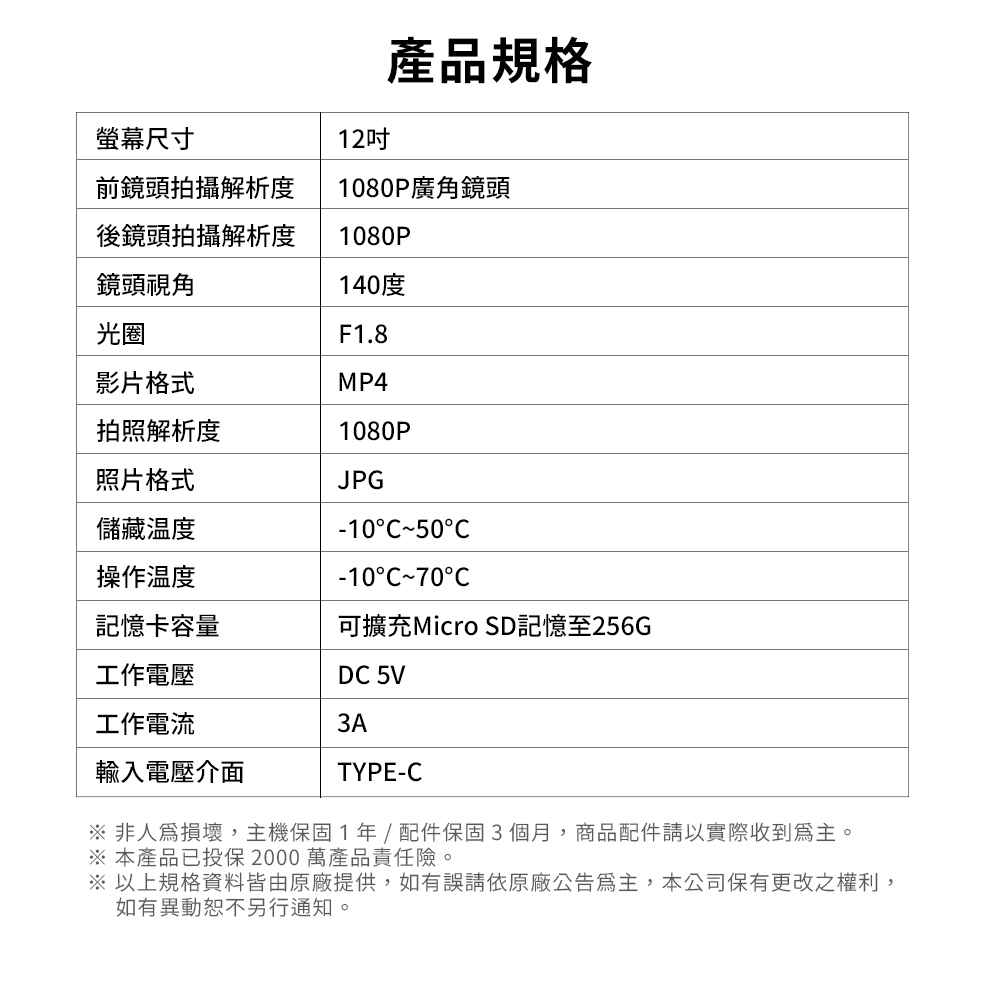 3.5m車充(或降壓整流電源線)/TypeC USB線/保卡/說明書/贈品(後鏡頭車牌架)