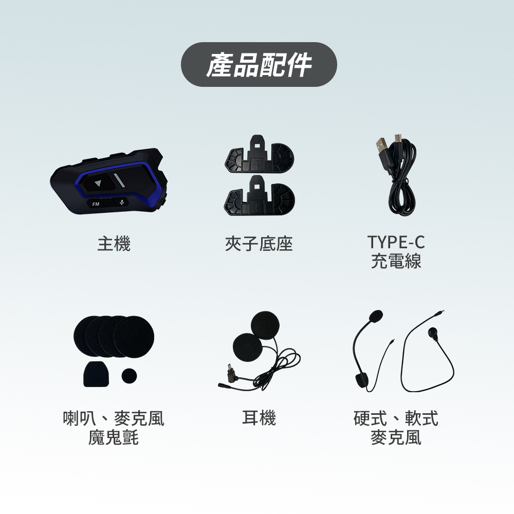 配件:主機*1/耳機*1/軟管麥克風*1/軟線麥克風*1/黏貼式魔鬼氈固定座*2/TYPE-C充電線*1