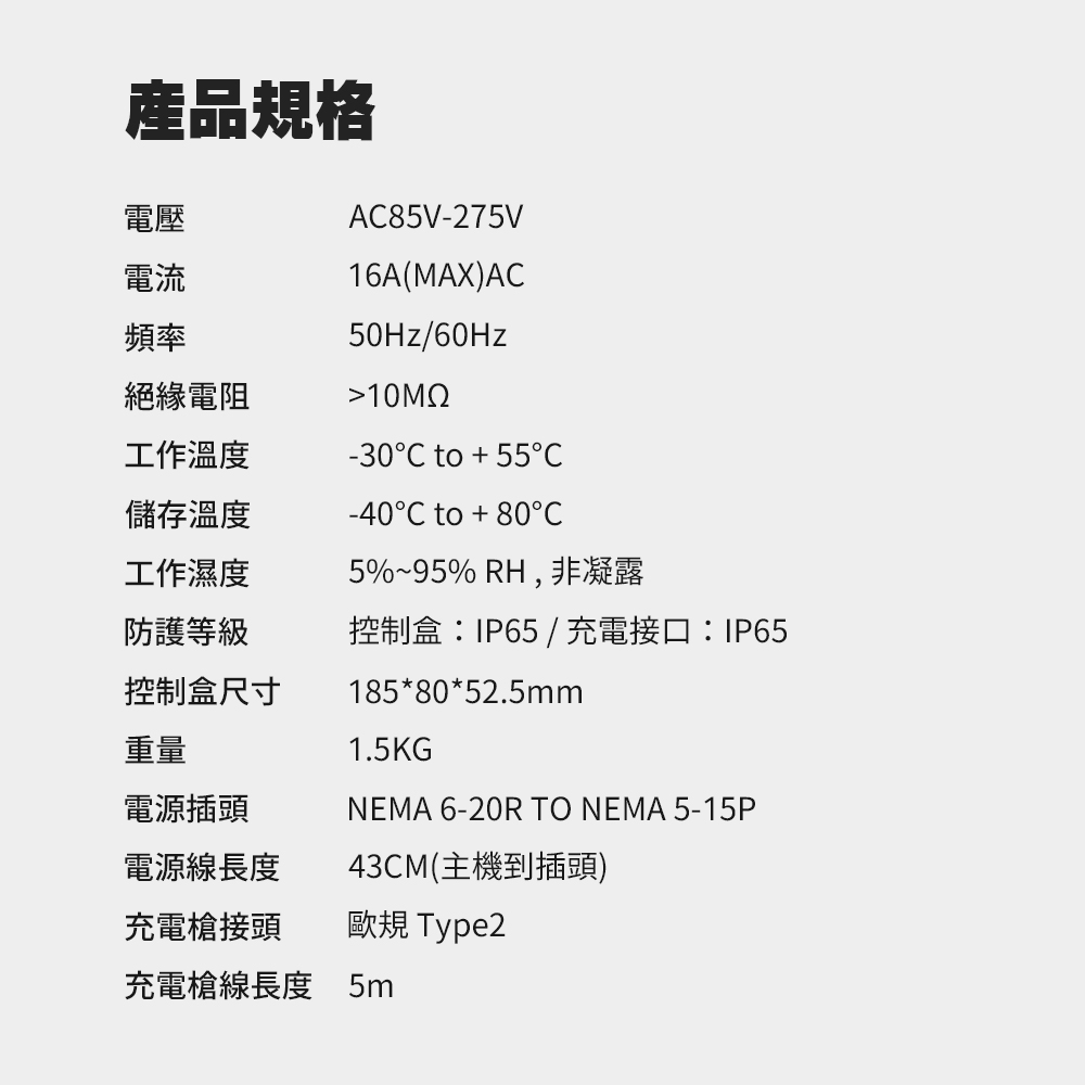 配件:控制盒主機/手提袋/NEMA6-20P 轉 NEMA5-15P接頭/說明書/保卡