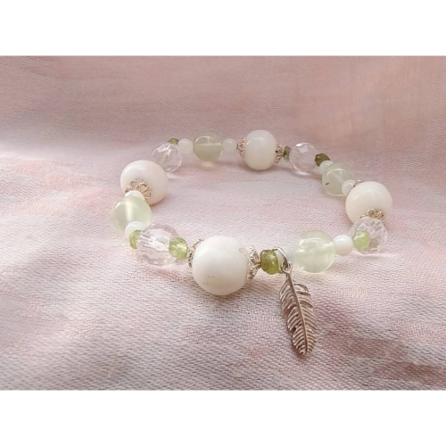 這款手鍊如同神聖的翅膀,帶你展翅高飛,提升內在的靈性與力量。龍宮舍利的神聖能量與葡萄石、橄欖石、硨磲珠的協調組合,讓你感受到內在的平靜與豐盛,純銀配件的精緻設計,為整體手鍊增添了高貴與神秘的氣質,帶來無限的守護與祝福🪽💫