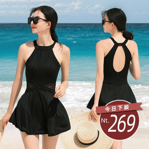 【D.studio】韓版露背百褶裙連身裙泳裝 帶胸墊 吊帶裙 吊帶褲 女裝【S133】