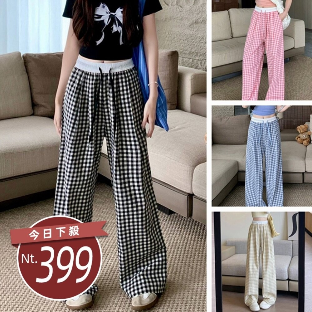 【台灣發貨】韓版薄款垂墜感格紋褲 寬褲 褲子 女裝【P378】