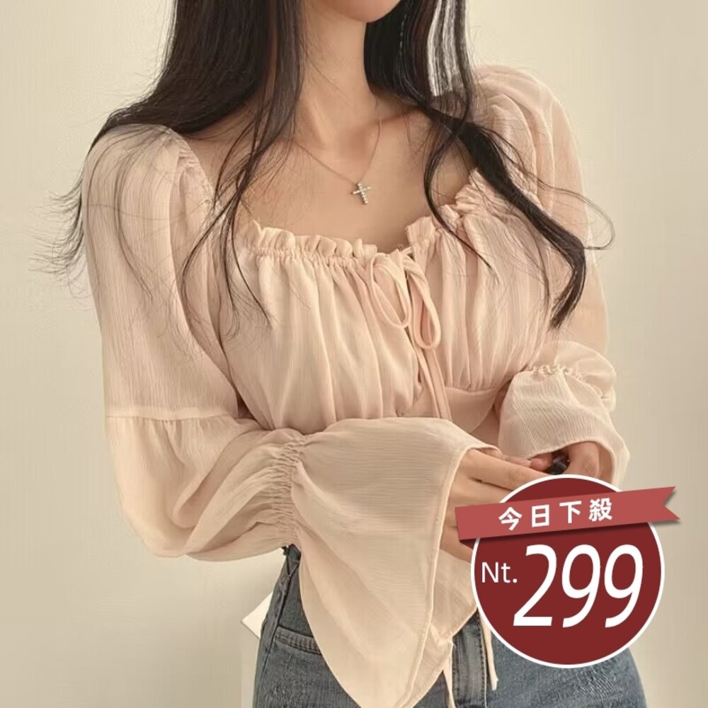 【台灣發貨】韓版法式氣質方領喇叭袖雪紡襯衫 長袖上衣 長袖t恤 衣服 女裝 上衣【W568】
