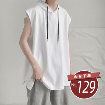 【台灣發貨】韓版素色基本款寬鬆連帽無袖上衣 小可愛 背心 衣服 男裝 上衣【V269】