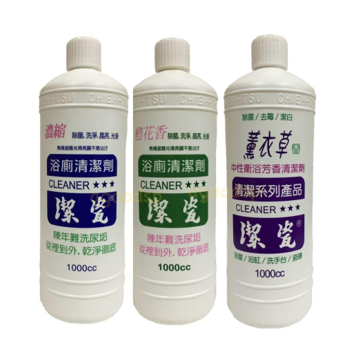 ** 暫不開放店到店取貨,敬請見諒 ** ********************************************** ** 箱購一箱(12罐),未滿 12 瓶請勿使用 ** ** 一次最多訂一箱12瓶 ** ** 請選擇 [賣家宅配-箱購] 物流選項 ** ** 多件運費可議,請私訊 ** ******************************* <品名> 潔瓷 浴廁清潔劑 <容量> 1000ml <規格> [濃縮浴廁清潔劑] ● 含特殊界面活性劑,超強洗淨配方,針對陳年難洗的尿垢,鐵鏽及黴菌, 明顯有效徹底去除,馬桶從裡到外乾淨徹底,連馬桶水管汙垢一併清除乾淨。 [橙花浴廁清潔劑] ● 含特殊界面活性劑,超強洗淨配方,針對陳年難洗的尿垢,鐵鏽及黴菌, 明顯有效徹底去除,馬桶從裡到外乾淨徹底,連馬桶水管汙垢一併清除乾淨。 [薰衣草中性衛浴芳香清潔劑] ● 本劑系純中性花香清潔劑,以特殊界面活性劑調配, 能迅速清除浴室牆面之瓷磚黴菌及浴缸、洗手台汙垢, 有著除菌潔白之功效,好洗、好沖、晶亮。 <產地> 台灣 <保存期限> 薰衣草 - 5年 橙花香 - 6年 濃縮 - 6年