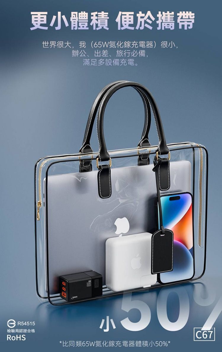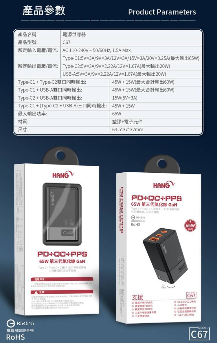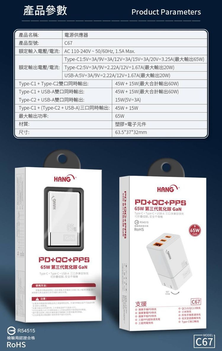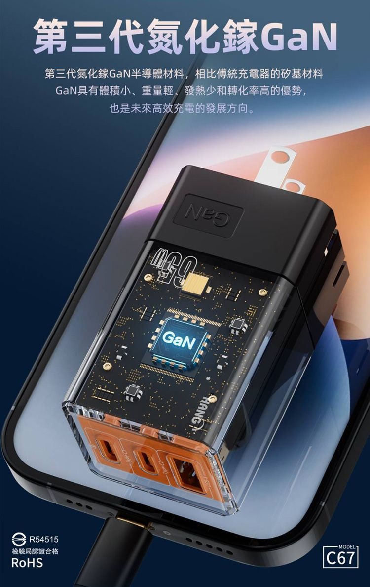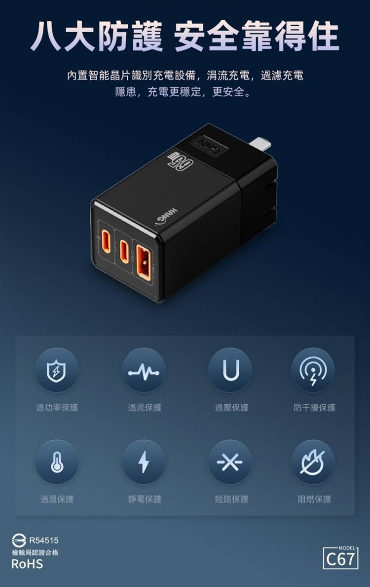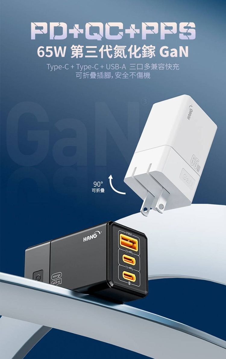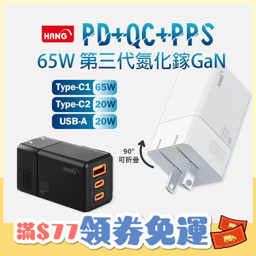 【HANG】 HANG 65W GaN迷你氮化鎵旅充頭C67 快速充電器2C1A 可充筆電 TypeC 雙USB充電頭
