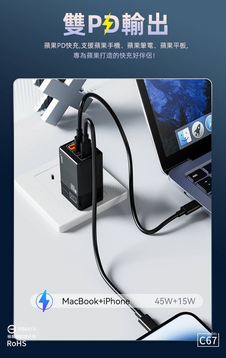 ▎Type-C1+USB-A雙口同時輸出:45W+15W(最大合計輸出60W)