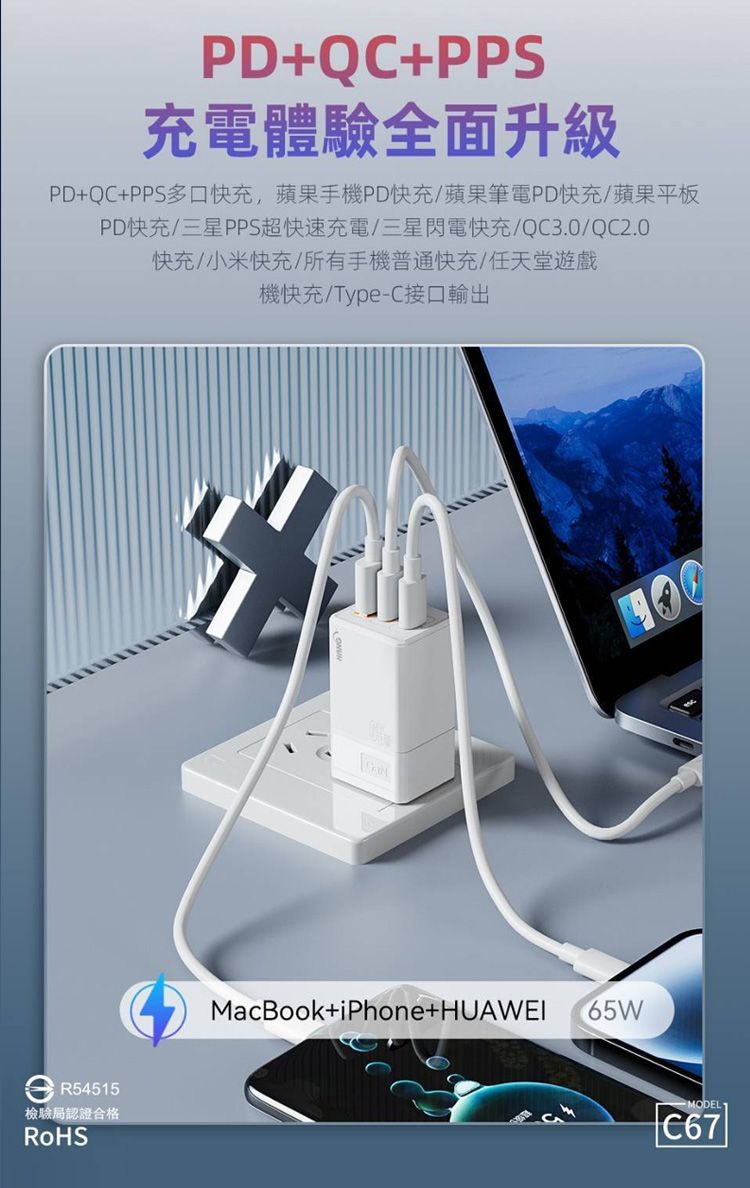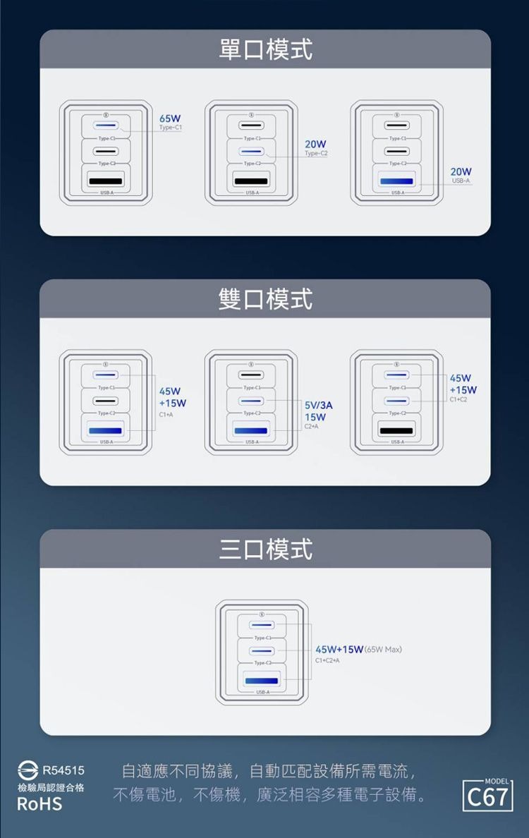 ▎Type-C1:5V-3A/9V-3A/12V-3A/15V-3A/20V-3.25A(最大輸出65W)