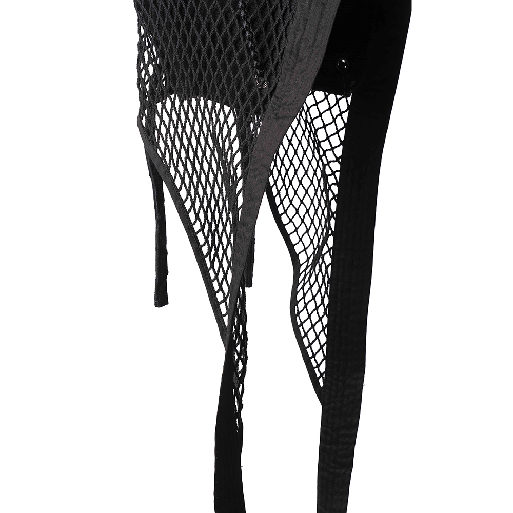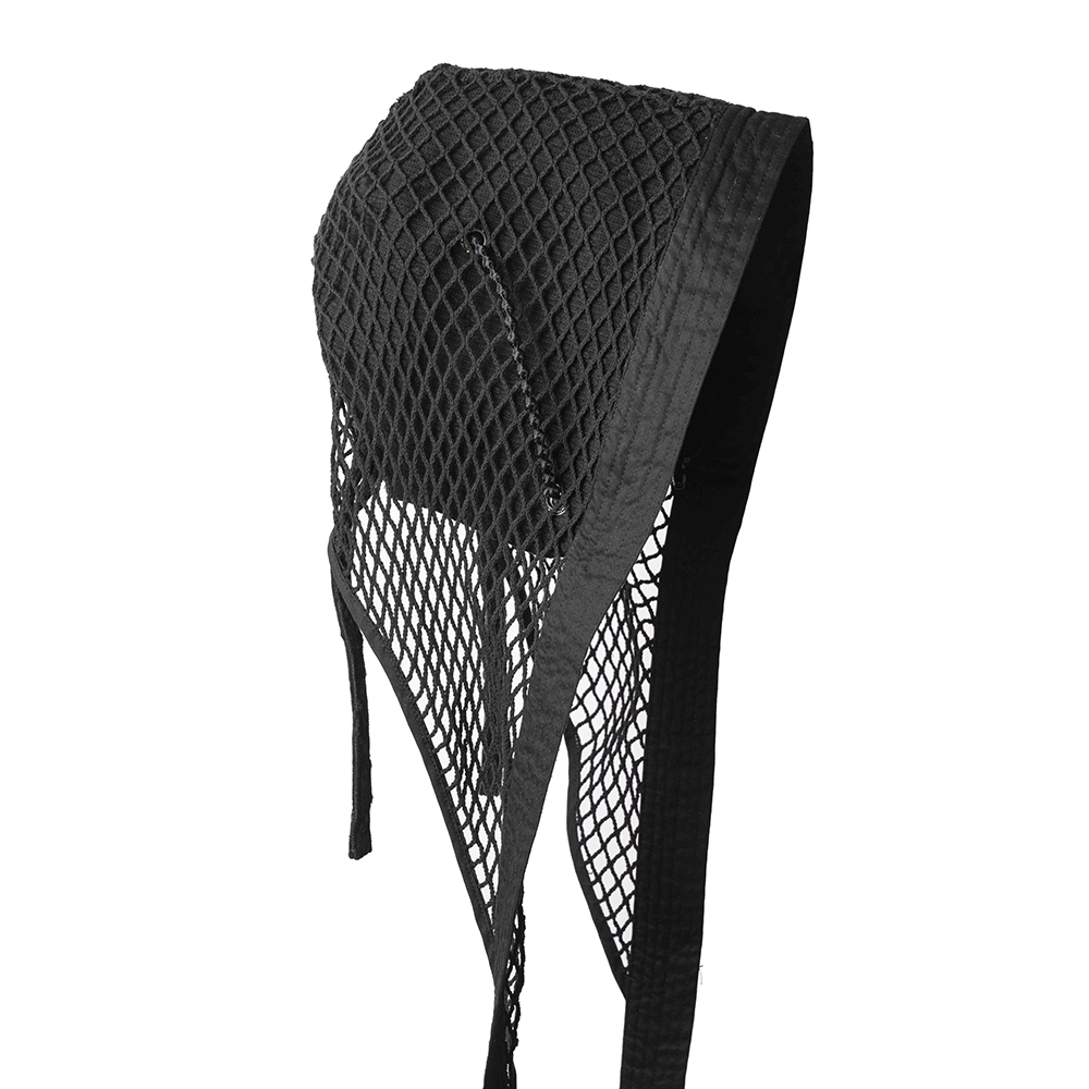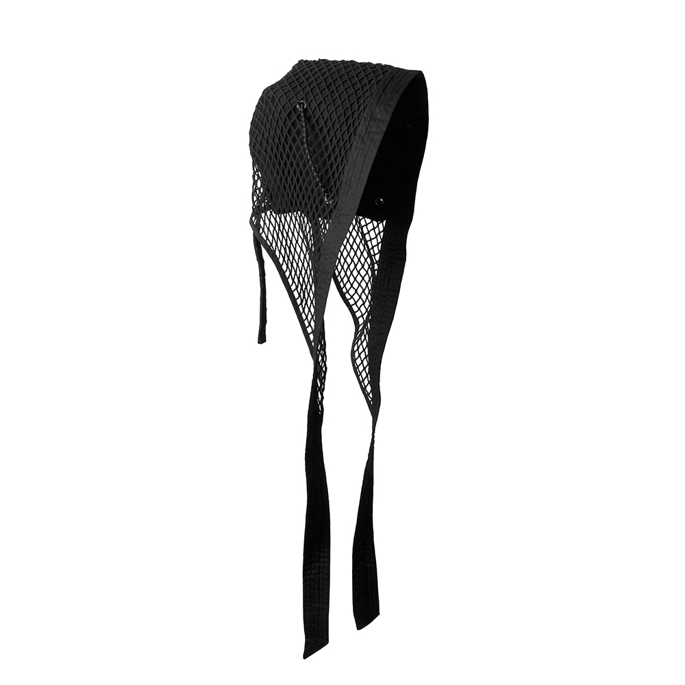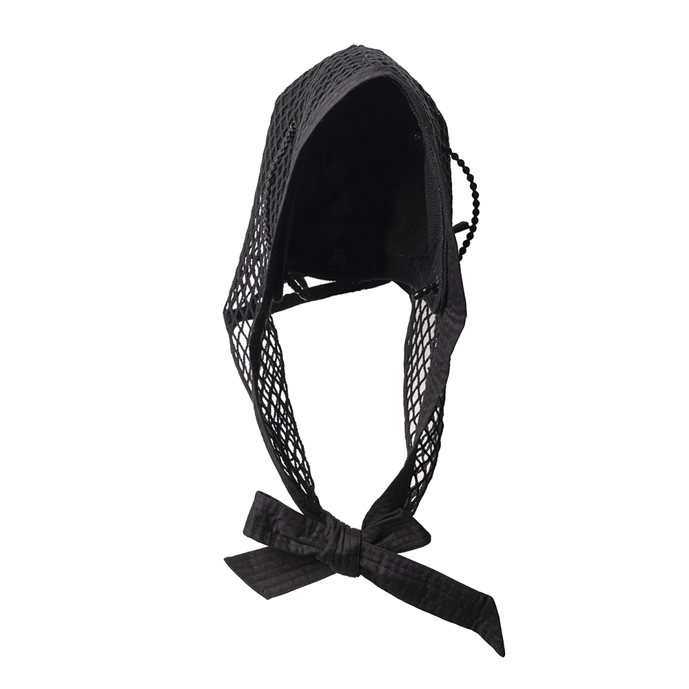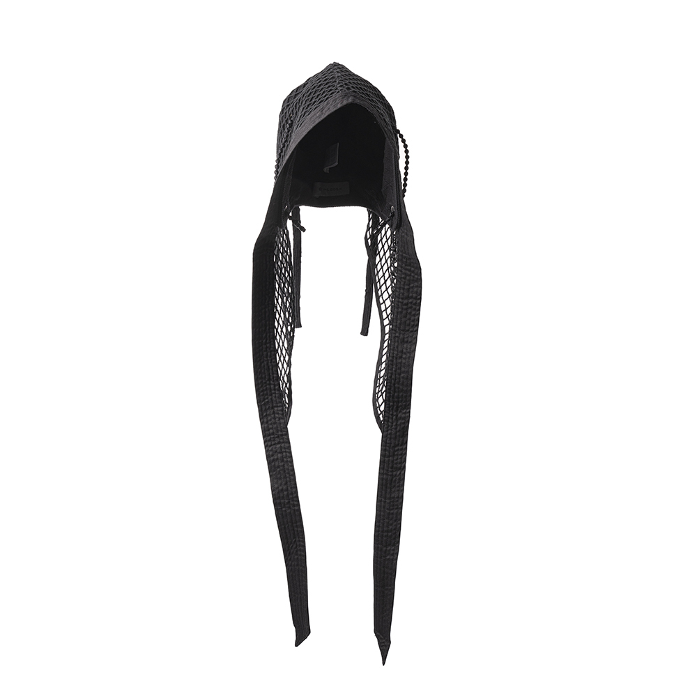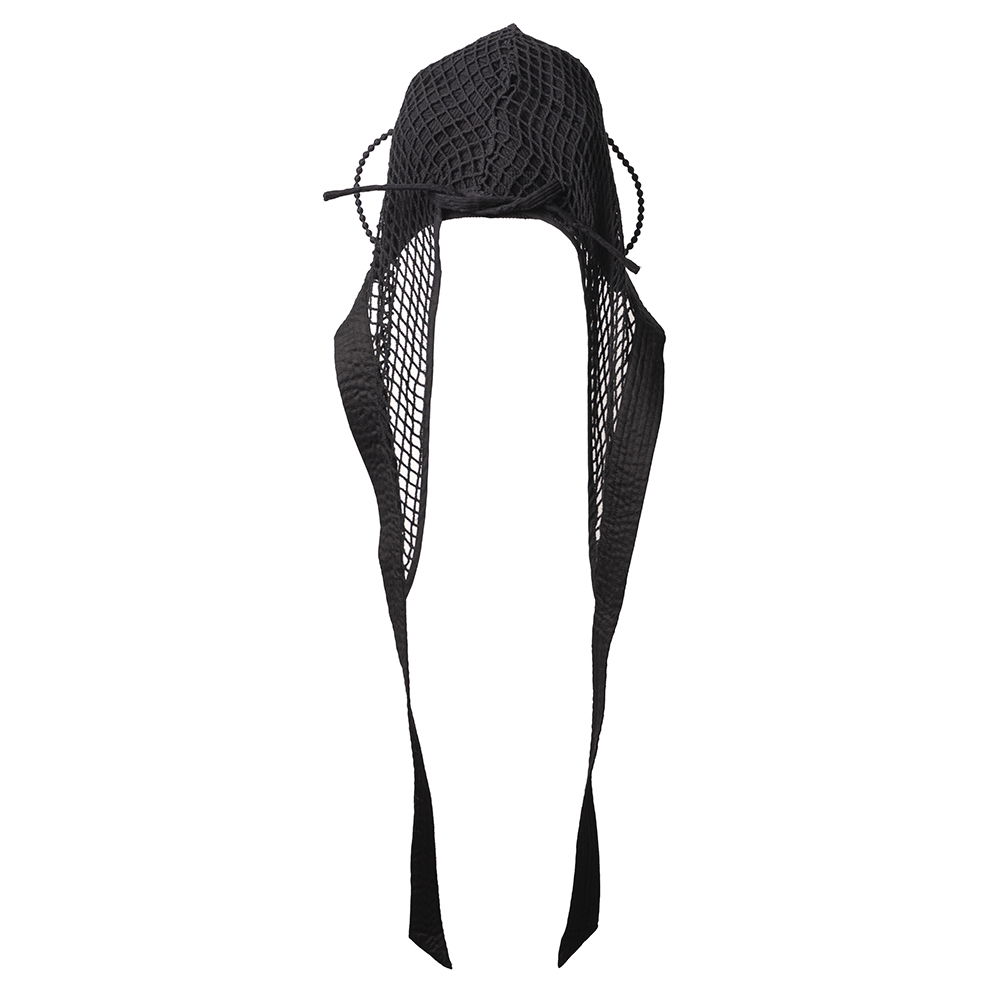 我們以Coif為基礎,做了一個更強烈的外觀,用網罩覆蓋並加上超長綁帶延伸造型,綁帶也可以打成蝴蝶結使用。
