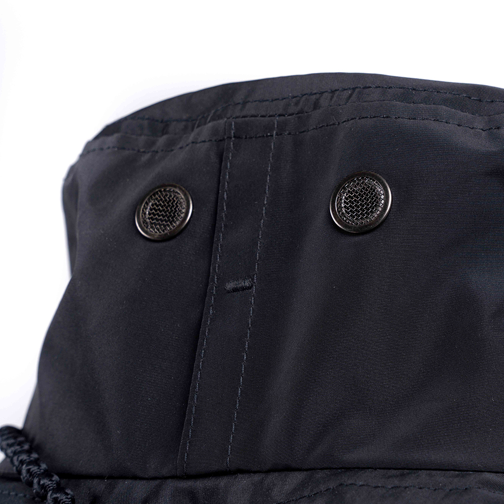 整體選用帶光澤的撥水布料,輕薄透氣之外,也為戶外的帽型帶來都會氣息的平衡。帽身兩側的開孔可使墨鏡更安穩的固定在頭上,也增加了透氣性。