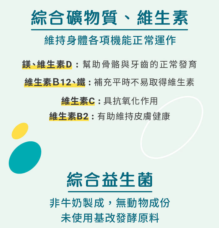【綜合益生菌】:非動物牛奶製成,未使用基改發酵原料。