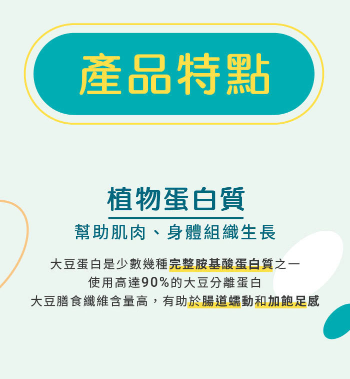 【分離大豆蛋白】:純植物配方優蛋白,幫肌肉組織功能修復。