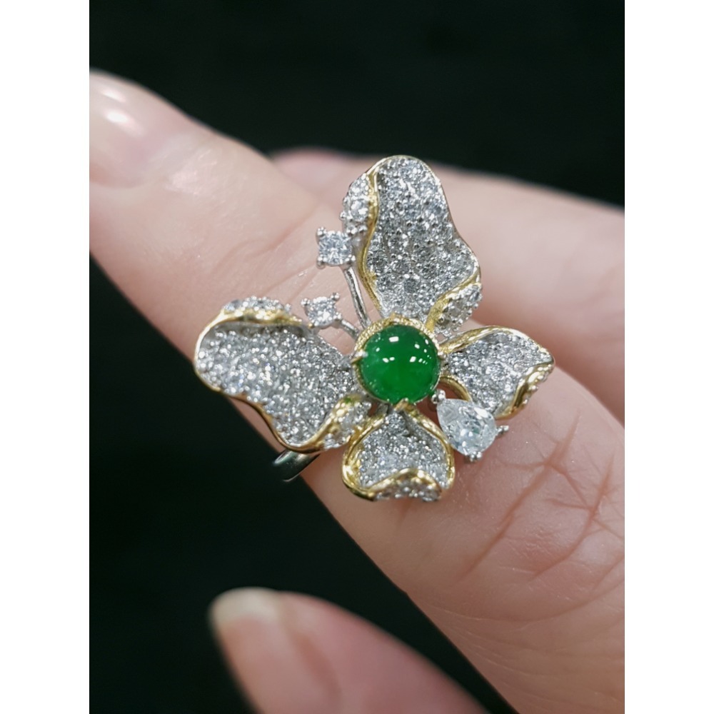 天然緬甸玉A貨翡翠蝴蝶 戒指 戒子 玉戒 925銀鋯石