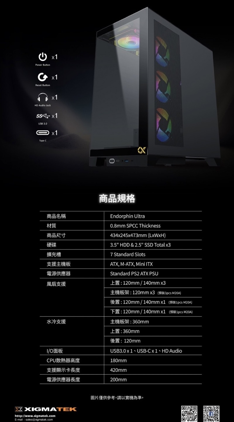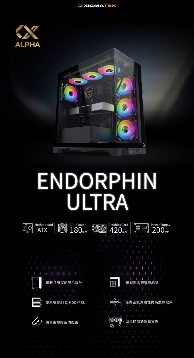 Xigmatek富鈞Endorphin Ultra ARGB ATX全景雙透側玻璃 海景房黑色機殼
