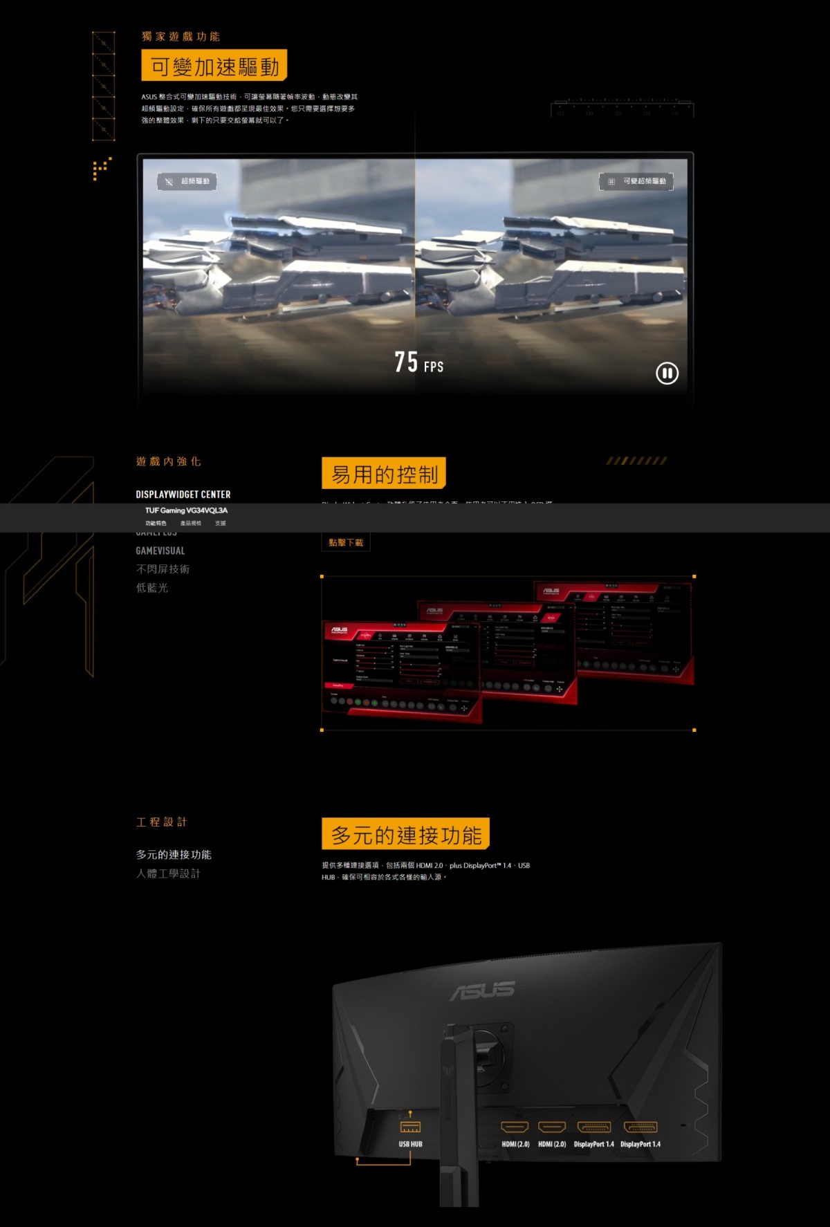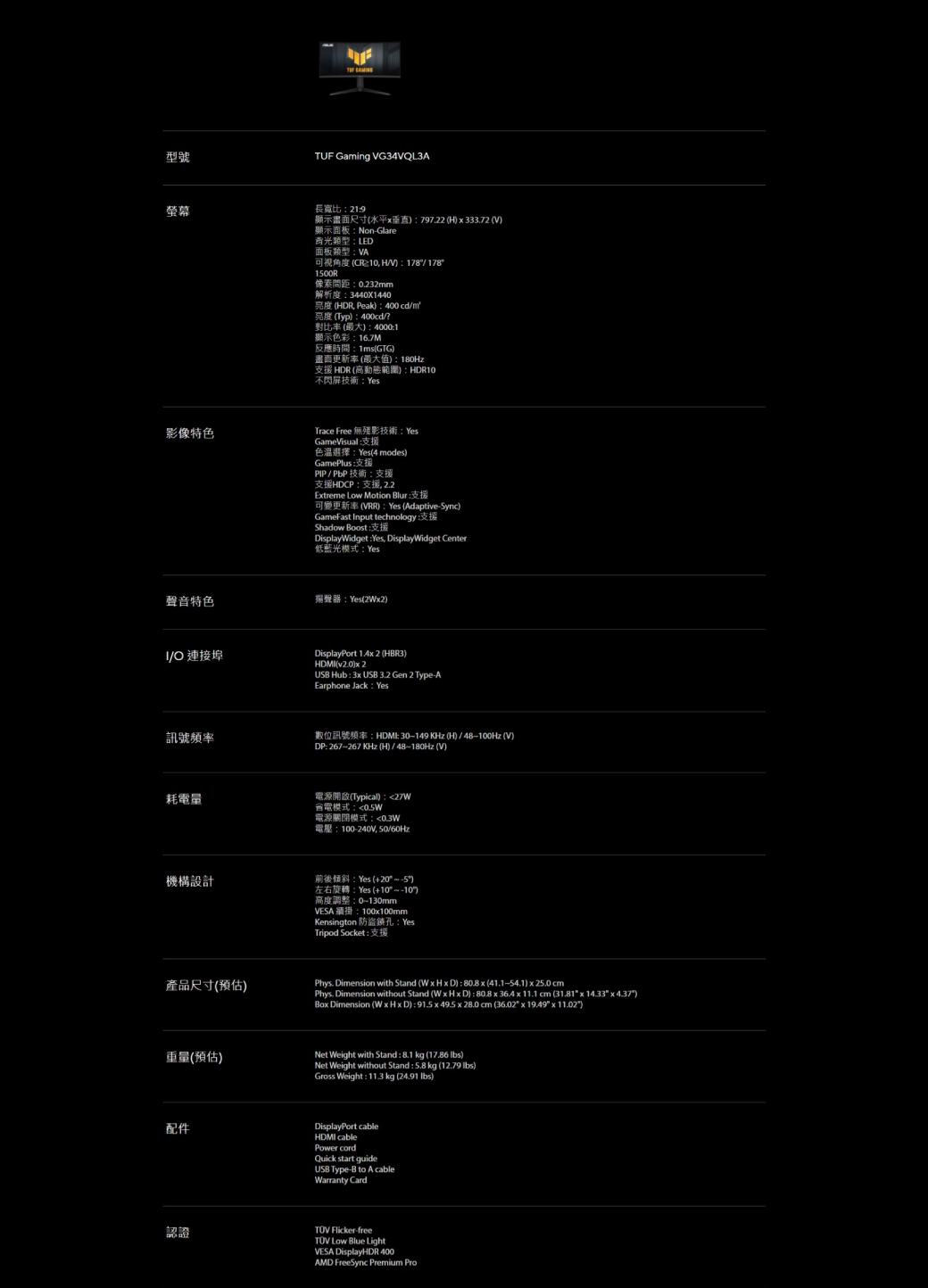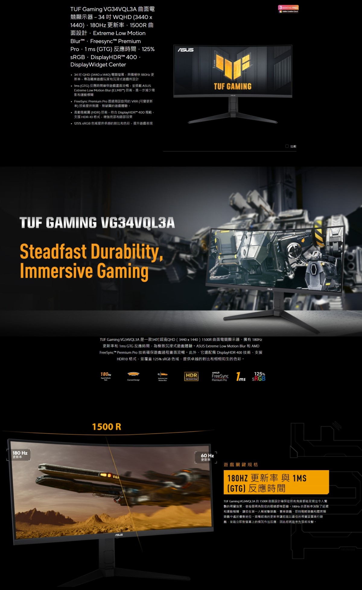 ✨賣家宅配=免運✨ASUS VG34VQL3A 曲面電競螢幕(34型/180Hz/1ms/HDMI/DP/VA)