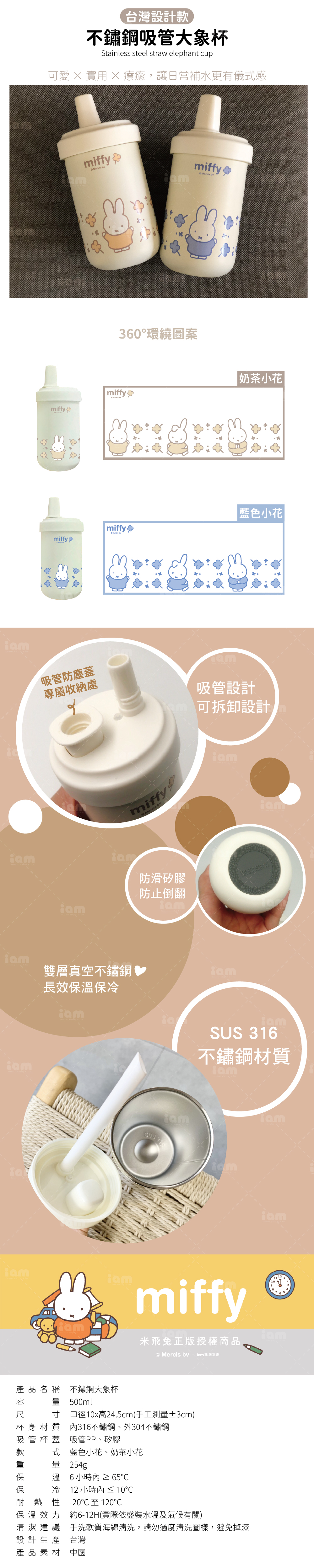 【MIFFY】不銹鋼大象杯 500ml 不銹鋼吸管杯 吸管保溫杯 保溫杯 咖啡杯 隨行杯