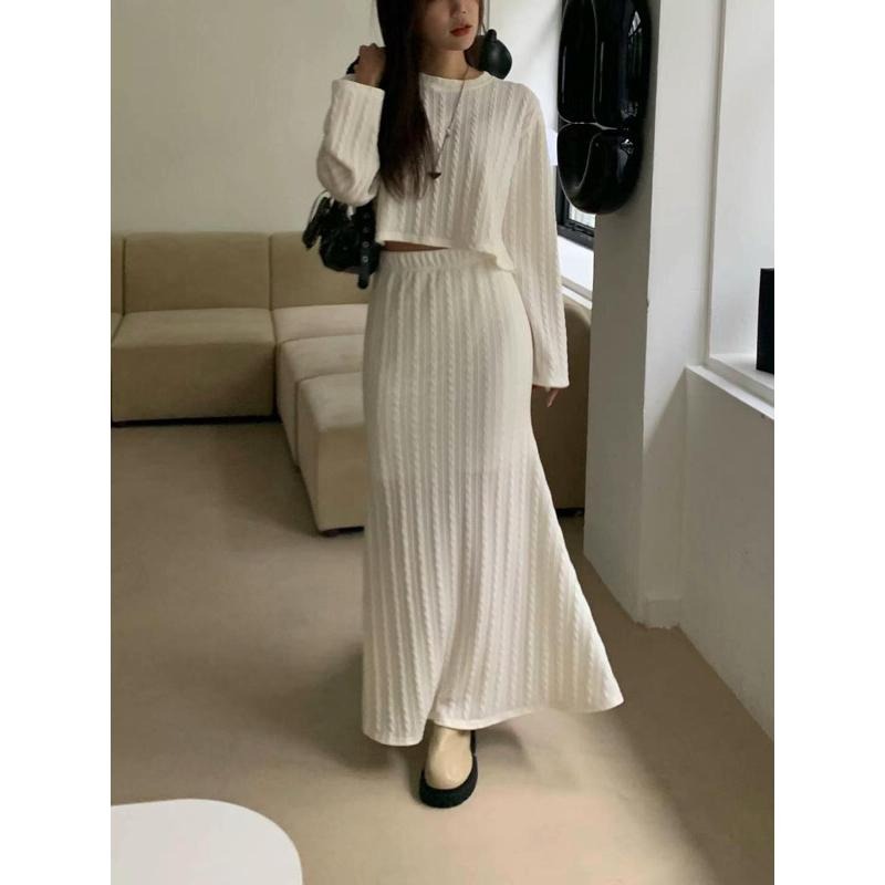 ▶ 產品:(扭紋針織 長袖短版上衣 + 超長裙)